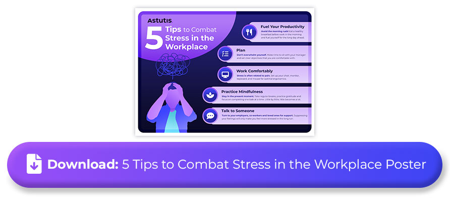 We hope you find these five tips helpful to tackle workplace stress. As a helpful reminder, we've created a free downloadable poster for whenever you'd like to refresh your memory on our top 5 tips.